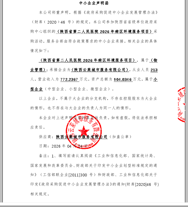 | 附件1 | 陕西云莱城市服务有限公司中小企业声明函.png | ||